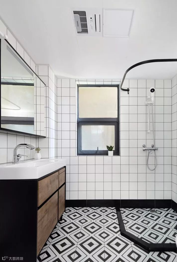 ▲ 卫生间运用黑白反差对比花色的墙地砖进行铺贴,墙砖底部的黑色脚线围边,承上启下将墙砖和地砖巧妙过渡,不会使整个空间过于单一而乏味。