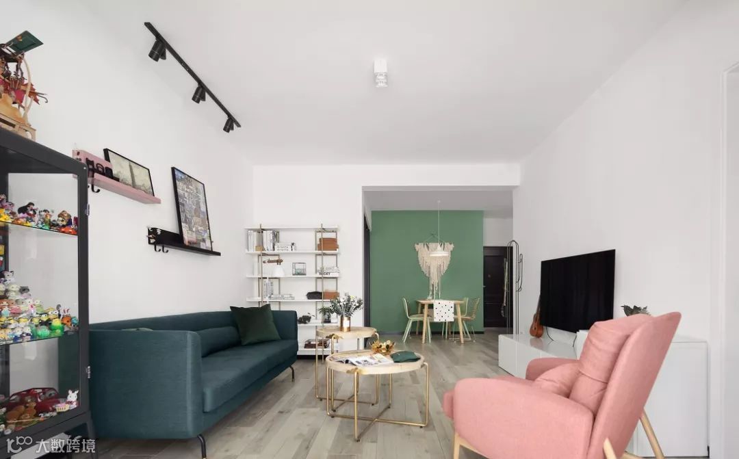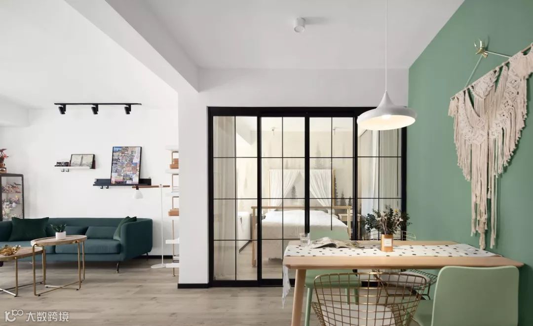 ▲ 从阳台看向客餐厅,视野开阔明亮,浅绿、茱萸粉、墨绿的清新魅力一览无余。