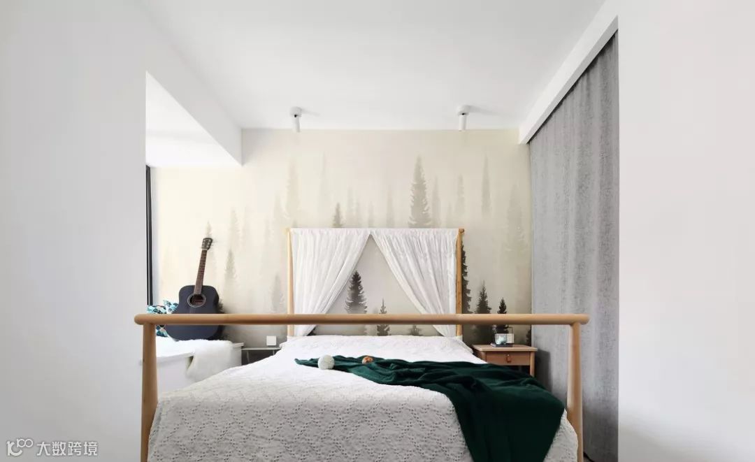 ▲ 次卧,硬朗质感的黑框玻璃移门,清新别致的迷雾森林壁纸,带来硬朗与柔和的碰撞。双人床的自然原木色更增加了房间的森系空气感。