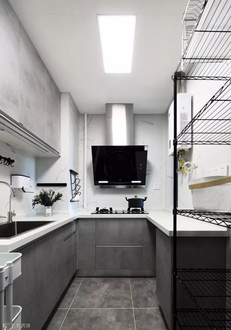 ▲ 厨房以黑白灰为主色调,白色让采光本就弱的厨房更明朗通透,水泥灰的质感简单而沉稳。