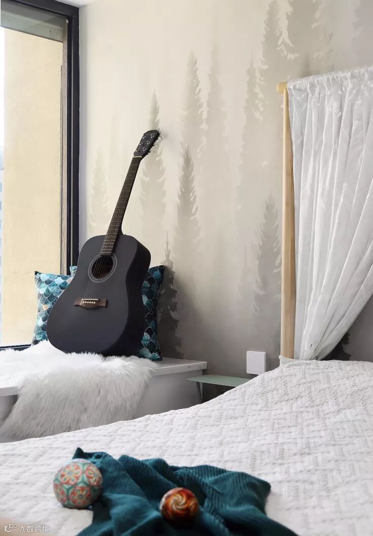 ▲ 床头边,一把黑色的吉他倚墙而放,随性洒脱,为整个房间增添了一些青春浪漫风情。