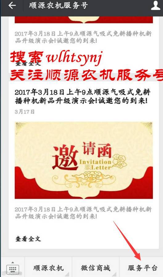 1、关注顺源农机服务号(wlhtsynj)