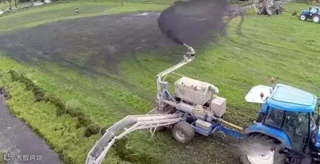 清理淤泥需要使用另一种机械,它有两根长管子,一根给河道里的淤泥增加压力,一根管子高高抬起将管道里的淤泥喷洒出去。