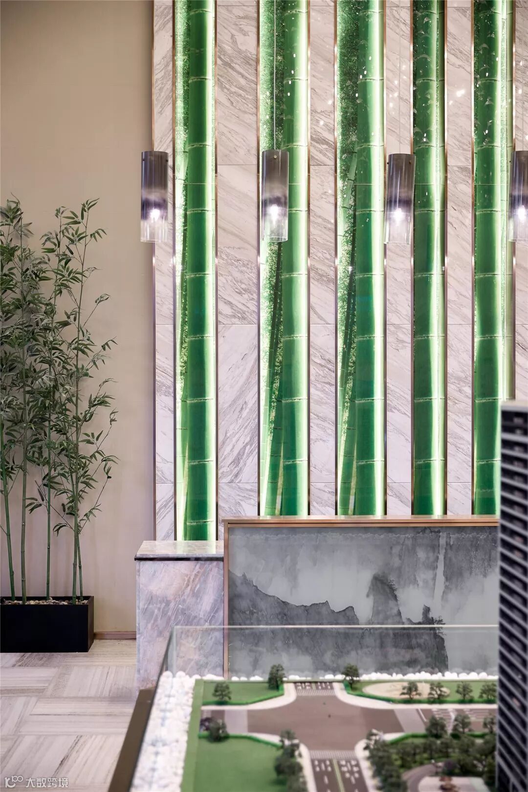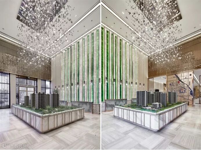 沙盘区上方悬挂的艺术吊饰,造型简约灵动,高低垂挂半空,凌乱中错落有序,与序列感十足的背景造型兼具连贯性且形成呼应,营造出该空间的跳跃简洁,灵气十足。