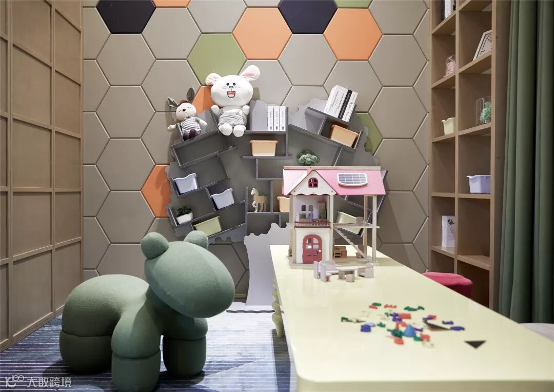 此外,空间色彩搭配上以自然的原木色为主色基调,浅灰、米黄作为辅色调节过渡空间层次,加以绿色、黄色点缀,清影玉色,丰富了空间视觉性。