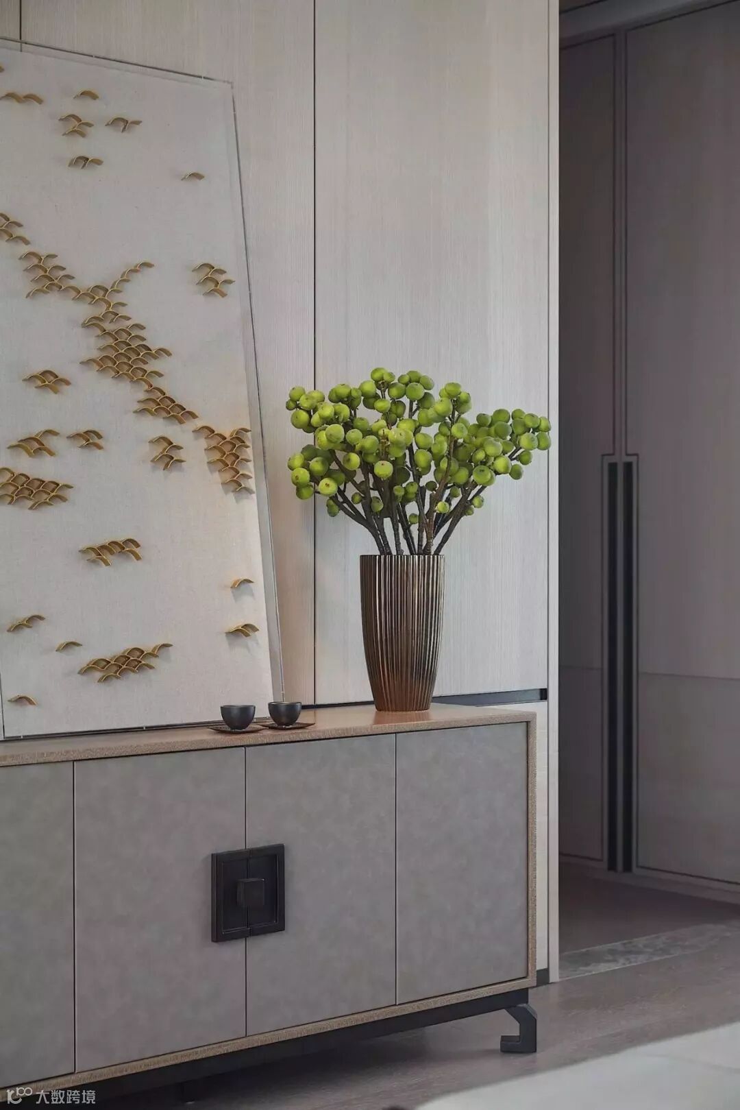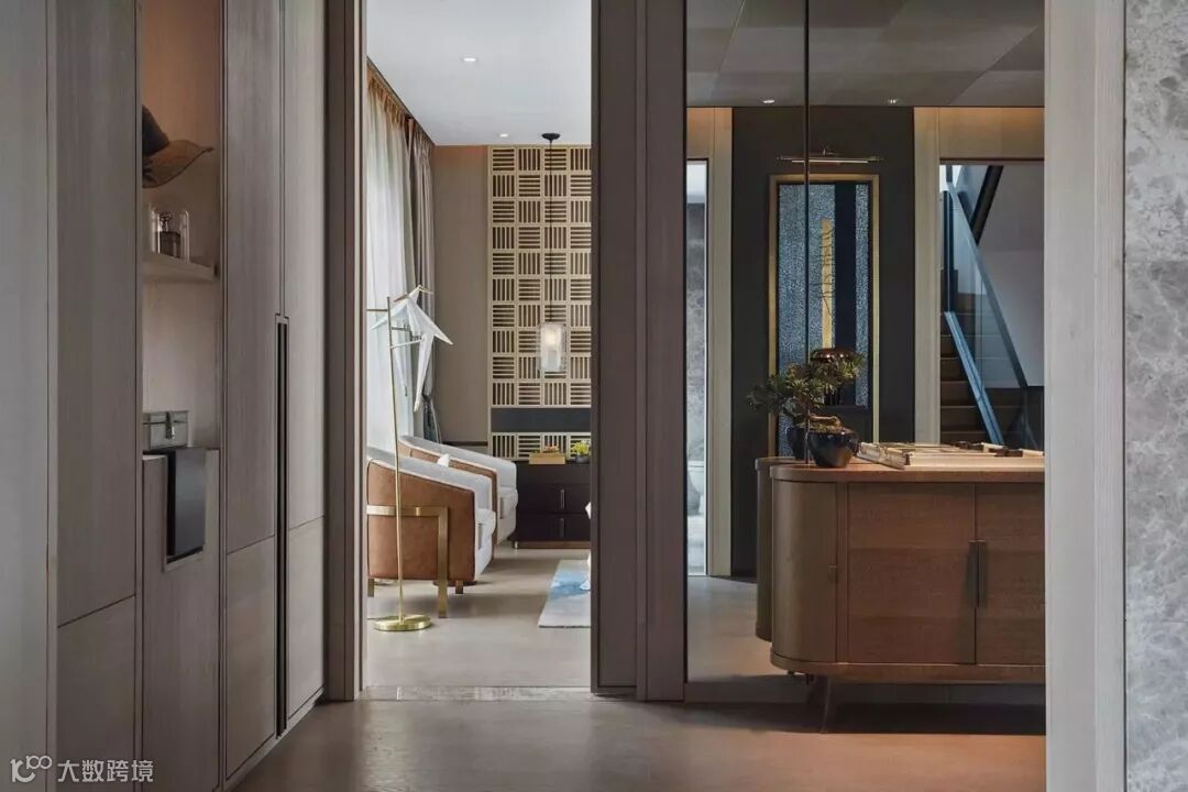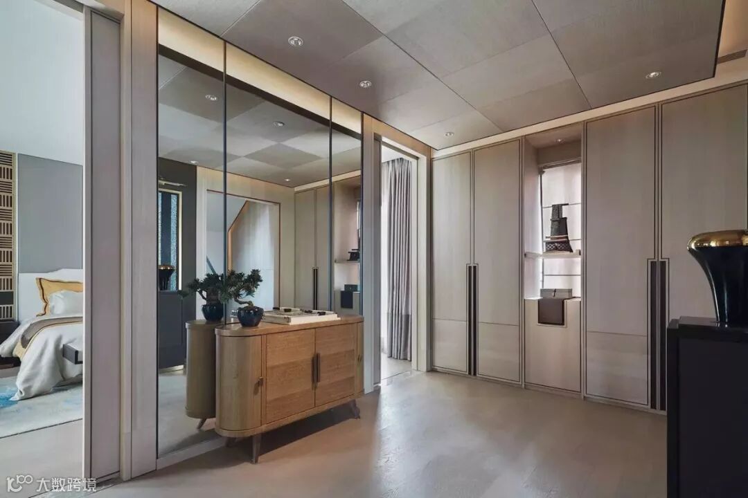 全木的壁龛及衣柜的对称设置、梳妆台及艺术品的点缀以及天花手工壁纸的拼花设计,为主卧衣帽间进行了全新的定位。