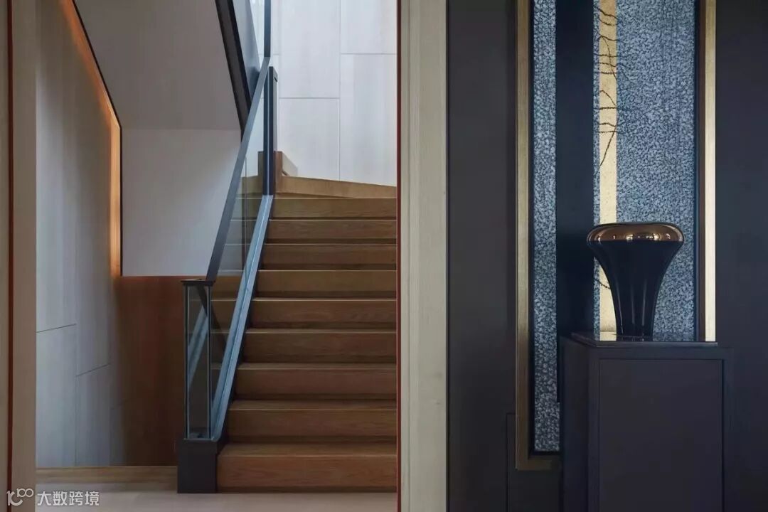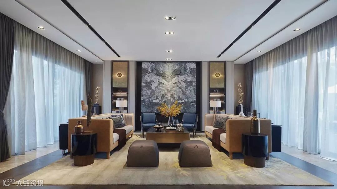 为保证豪宅的视觉感受,一层客厅取消了传统高挑空的处理,取而代之的是大尺度开间,一进门就给人以宽敞舒适的感受。
