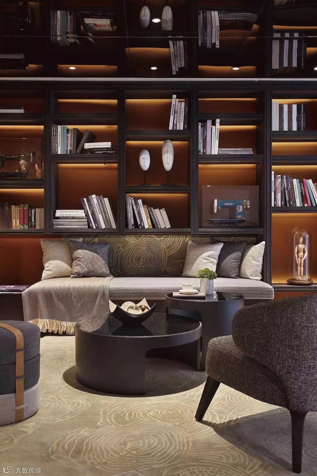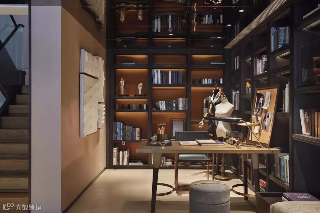 负一层与负二层也最大限度地利用了采光,并用超大的书柜墙将两层上下贯穿,融合成一个整体,并在书柜区域设计了一步宽的廊道,让这个读书区更加实用和有趣。