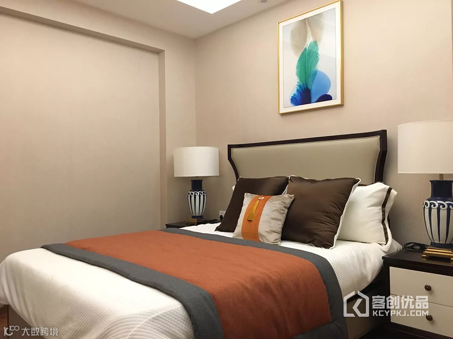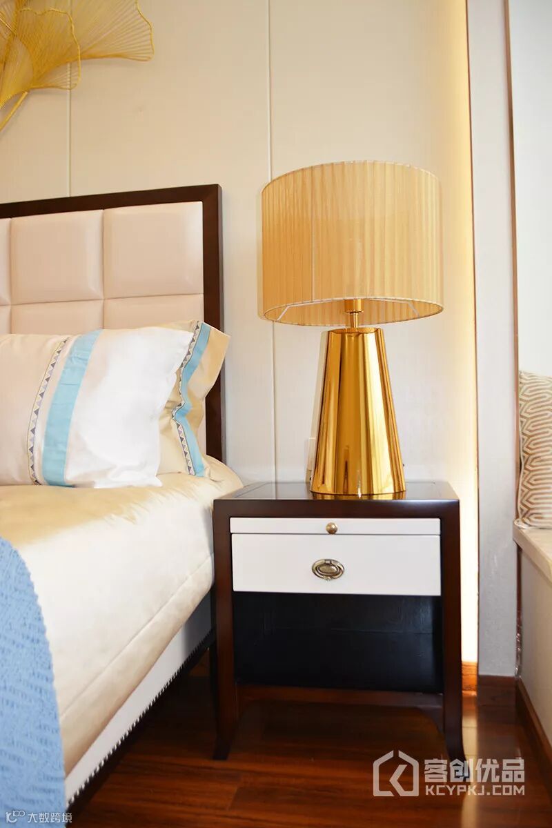 高雅自由的主卧空间,大到软包床及床头装饰,小到一盏几何感台灯,都是设计师经过精心的搭配,诠释对于新中式浪漫情怀的解读。