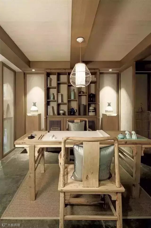 一个茶香墨韵的新中式书房在表现了其自身的功能与形式外,通常也可以窥见主人的身份与品位。因而常常在庄重典雅的氛围中流露出深厚的文化底蕴,给人一种涉足探步的冲动和欲望