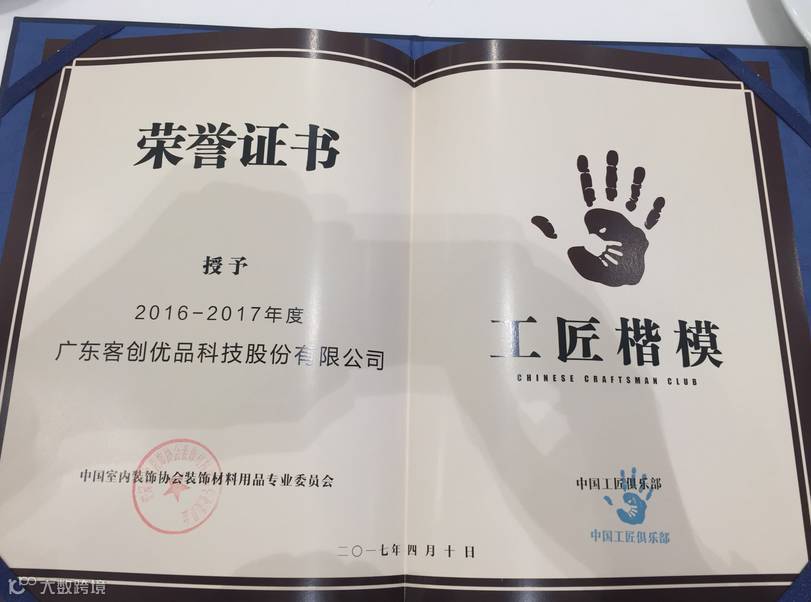 严格监管每一个施工细节,努力践行“工匠精神”的互联网家装企业 广东客创优品科技股份有限公司,荣获“工匠楷模”国家级殊荣,陈建京董事长的企业 东莞市热线家具有限公司 同时也荣获“工匠楷模”国家级荣誉。
