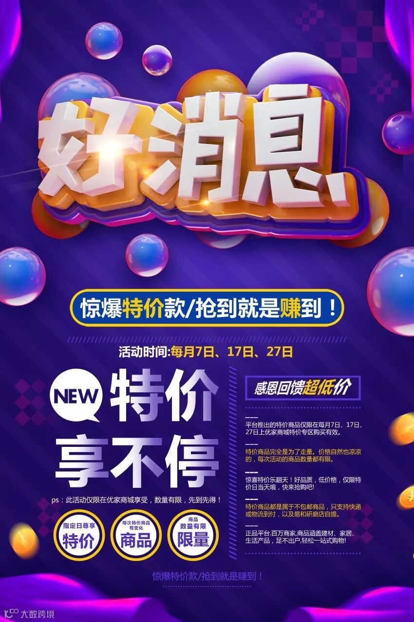 优家宝平台为感恩回馈新老客户,每月的7日、17日、27日为平台特卖惠日,届时热门的产品将以特价销售,数量有限,售完为止!