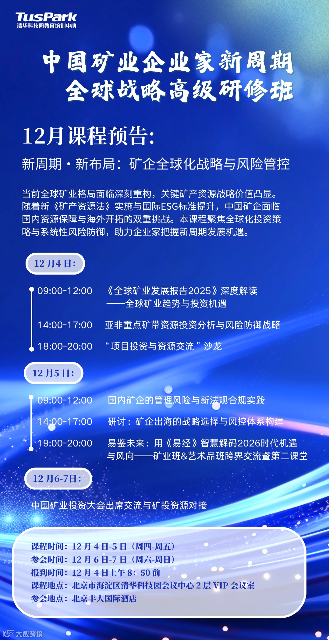 为助力矿业企业家在全球矿业重构中把握战略机遇,中国矿业企业家新周期全球战略高级研修班推出核心课程——《新周期·新布局:矿企全球化战略与风险管控》,将于12月4-5日正式开课。课程将深度解读《全球矿业发展报告2025》,分析亚非重点矿带投资机会与风险,探讨矿企出海的战略选择与风控体系构建。学员还将于12月6-7日参加中国矿业投资大会,实现面对面交流与资源精准对接。