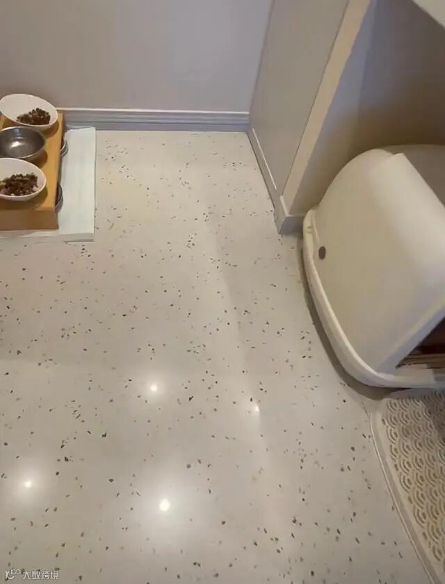 ▲上图就是网友分享的整块水磨石大板的实景效果图。这种的水磨石是没有缝隙的,是工厂浇筑成型然后运到现场进行切割的。