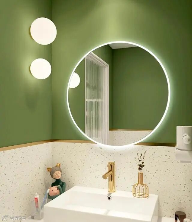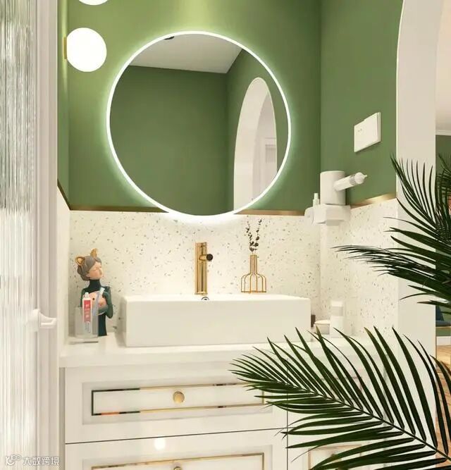 纯色系的绿色小色块水磨石半墙设计,搭配同色系的绿色墙漆,再局部辅以金色元素,整体时尚、灵动的气质拿捏得刚刚好。