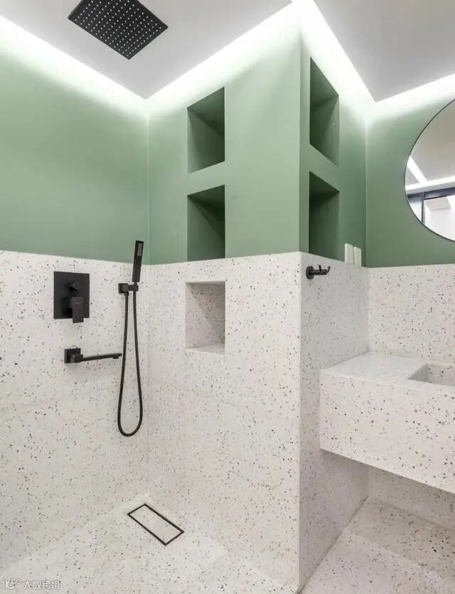 水磨石尽量不要大面积铺设,可以借鉴下图中的形式,比如半墙设计、单面墙铺设等。