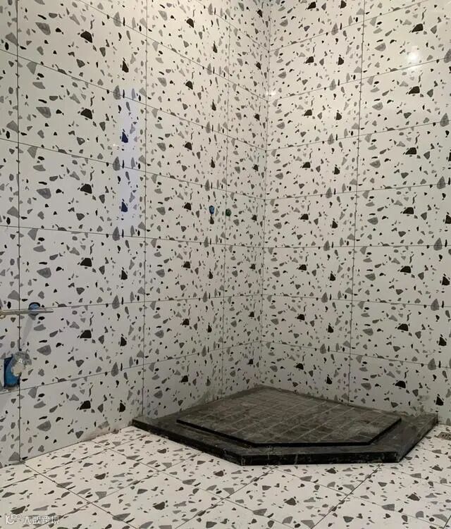 水磨石图案最突出的特点就是上面有大小不一的各种“小点点”图形,大家肯定会纠结选择大色块还是小色块,小编建议大家选择小色块,更显精致。大色块如果颜色很重的话,特别容易造成瓷砖翻车。