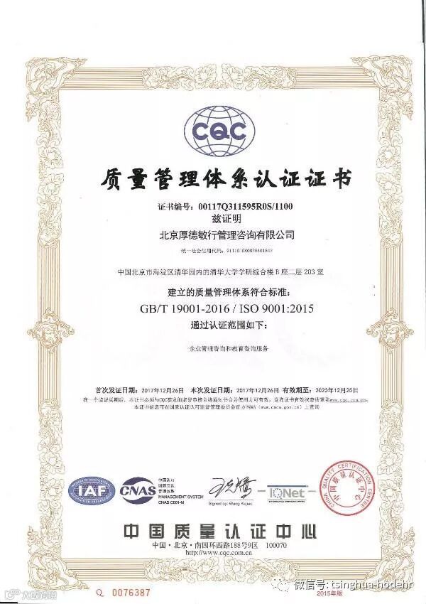 为进一步提高公司管理水平和服务质量,规范销售操作流程、有效控制风险、提高销售收益,形成标准化经营、规范化管理的模式,北京厚德人力资源发开有限公司(简称“厚德人力”)与北京厚德敏行管理咨询有限公司(简称“厚德敏行”)于2017年初启动了ISO9001质量管理体系的建立与实施工作,并于2017年12月初顺利通过了中国质量认证中心关于ISO9001质量管理体系的认证和审核,2017年12月18日获得了ISO9001质量管理体系认证证书。