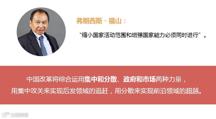 大家都知道福山,福山讲的我们看一个理论体系,一定要看它整个的表述,不要拿一句话出来讲,福山的很多话,历史的终结什么什么的,大家都看到,但是福山后来讲的一句话,叫做“缩小国家活动范围和增强国家能力必须同时进行”,这句话很多人不看。把它忽略掉。