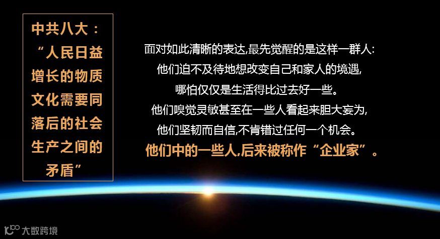 现在中国的企业家和我们的国家一起走进新的时代,一代人有一代人的命运,但是对于我们企业家,我们的命运早就命中注定,他们是最为活跃的变革力量,也必将改变商业,改变我们的生活。