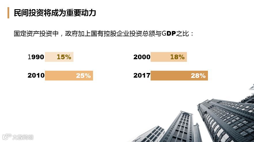 再看我们民营企业的使命,固定资产投资中,政府+国有控股企业投资总额与GDP之比,1999年只有15%,2000年到18%,再到2010年和2017年你们看,这能持续吗?