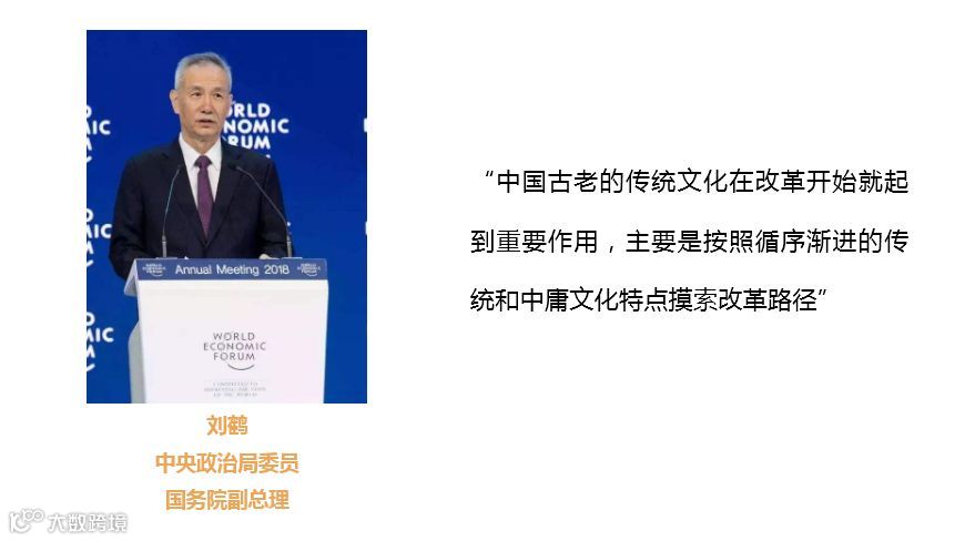习总书记对中国传统文化包括对阳明心学的高度的评价,和我们的刘副总理的话结合起来看,我们就可以看到中国人是不激进、不剑走偏锋的。那么我们就可以看到,中国的改革已经超越了人类积累的经济、社会知识既定模式。