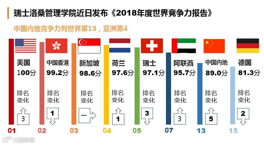 我们中国排到90分以下,中国现在在世界排名第13,亚洲排名第4。我们看到下面的框框,中国比去年竞争力上升了5个位子。