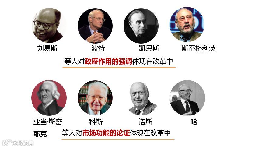 我们大家看一下,上面这一排经济学家,刘易斯、波特、凯恩斯、斯蒂格利茨,这些人有一个核心观点,强调政府的作用,就是讲政府的作用,认为政府作用非常大。