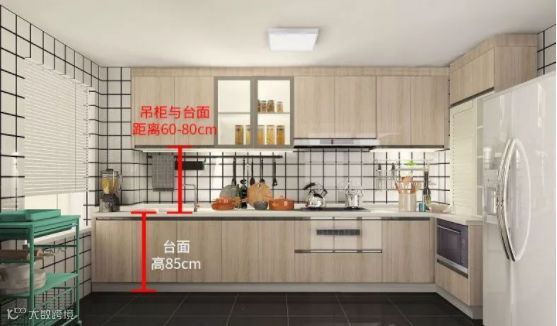 3、橱柜地柜高度要量身做,按常做饭的人身高算:身高/2+5~10cm,吊柜离地柜60cm,进深35cm,里面的东西伸手就能够到。