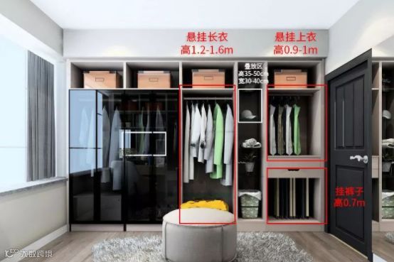 2、衣柜深度60cm,至少要比肩宽;挂大衣高度1.2到1.6米,短衣区高度1米,挂裤高度70cm。