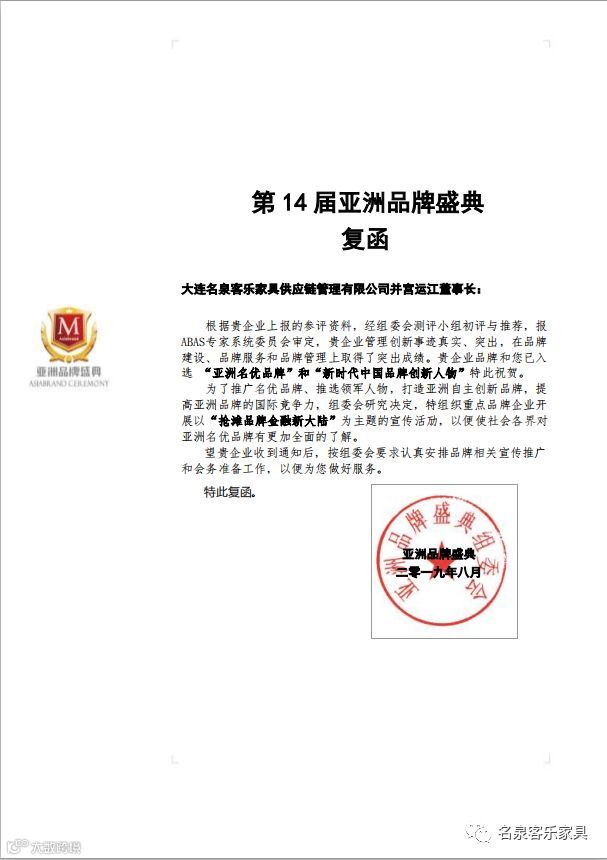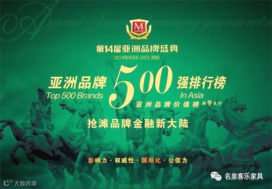 2019年9月9日,被誉为亚洲品牌界年度“奥斯卡”的第14届亚洲品牌盛典于深圳举行,政要名流、行业协会和知名企业齐聚一堂,共鉴品牌力量。作为家具行业的优秀企业,我们“名泉客乐家具”也受邀出席本次活动。各个行业优秀的企业代表在盛会畅谈品牌发展,共同见证亚洲品牌的辉煌与魅力。