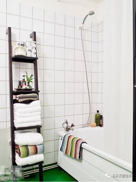 ▲置物架可以摆放一些洗漱物品,取放都十分的方便,而且便于清理,底部的空间可以作为毛巾架/擦地巾架,或是安装几个挂钩,将刷子等小物件挂起来。