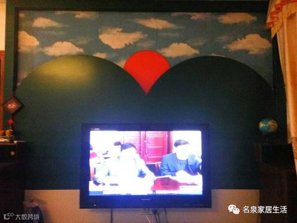 这个背景墙想要表达的是在两座绿色的小山之间透着唯美的夕阳,听起来很有意境的,但是这个乍一看上去,不会觉得它像点什么吗?