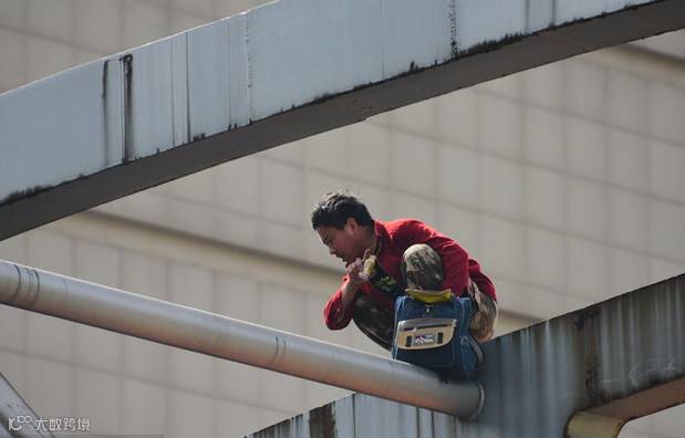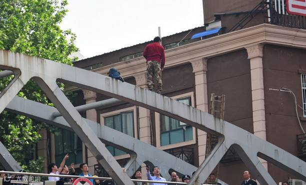 该男子站立在宽度只有十几公分的横梁上,险象环生,围观的市民都替他捏了一把汗,纷纷劝他下来。