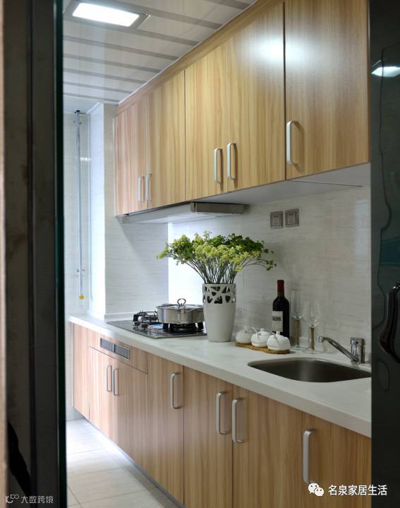厨房采用上下收纳橱柜,厨具用过后可以放到柜子里,保持台面的整洁。