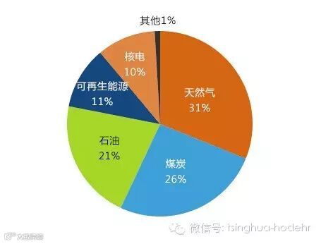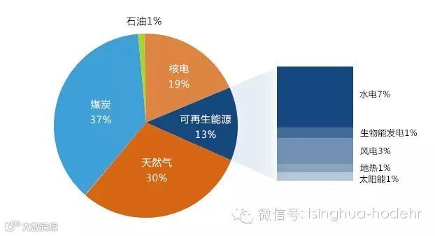 美国大部分电力是来自化石燃料发电,煤电最多,占比37%(2012)左右;其次是天然气发电,占比30%;石油发电最少,不到1%;核电占比19%左右。可再生能源发电占比近13%,其中:水电近7%,生物能发电大约1%,风电大约3%,地热和太阳能发电均不到1%。