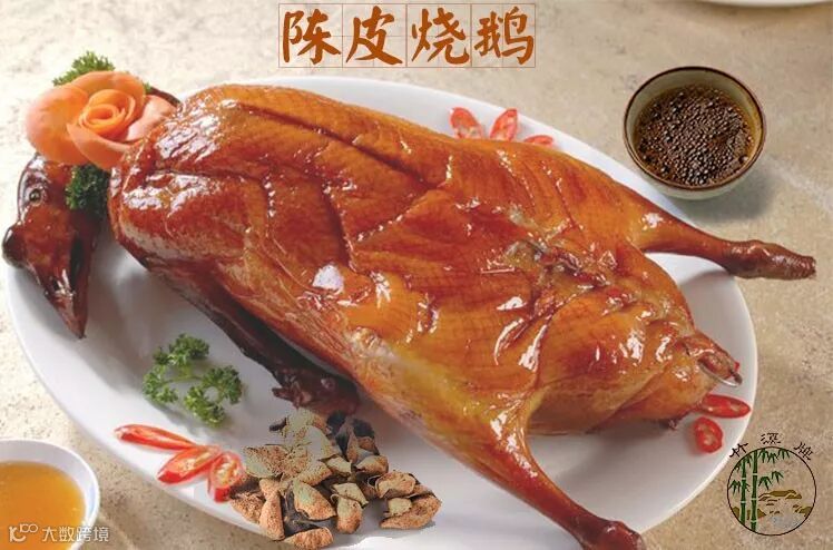 陈皮烧鹅是经过 秘制酱油和精选10年陈皮 烤制而成,香飘十里。