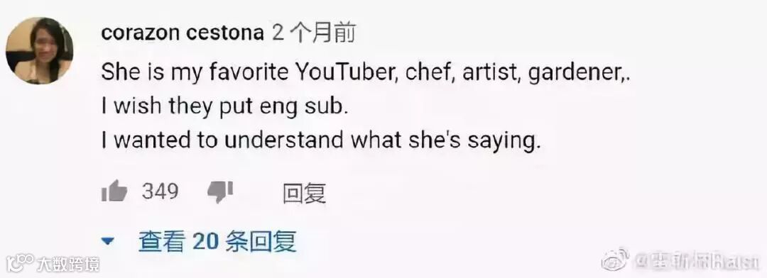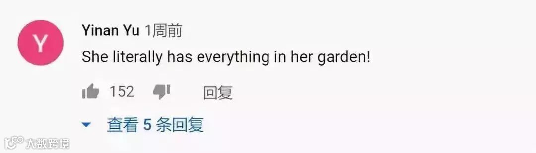 这个人说:她是我最喜欢的博主,她是一个大厨、艺术家、园艺家,我希望他们能加上英文字幕,我太想知道她在说什么了。