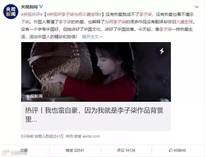 而日前,“人民日报评论”也发文表扬了李子柒: