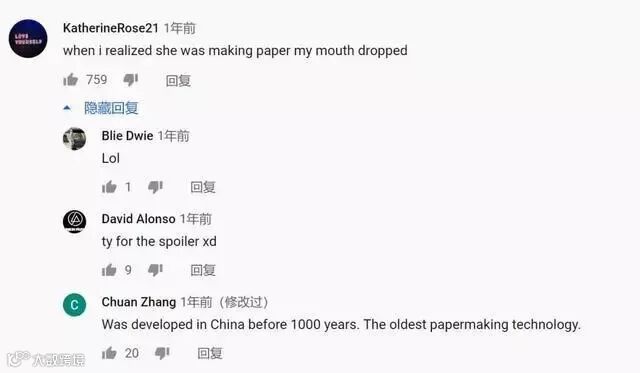 在李子柒做“古法长安纸”的视频下,很多外国人因为这样的造纸方法惊掉了下巴,然后又有中国人用英语给他们科普这是很早以前就有的造纸术。