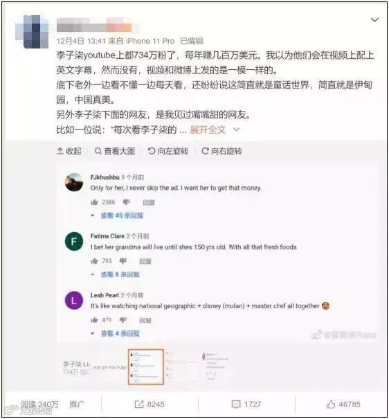 文中似乎亦评论了网友对于李子柒的质疑,原文中称: