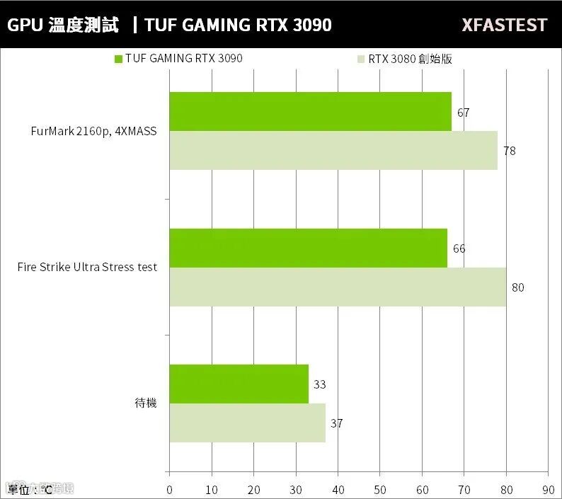 才能发挥出强大性能,使用 Fire Strike Ultra Stress test 与 FurMark 2160p, 4XMASS 进行“烧机”测试,RTX 3090 的温度并没有让我们失望,TUF RTX 3090 最高温度只有67°C,这样的散热性能非常暴力,但RTX 3080 的温度却达到80℃,两者差距可见一斑。