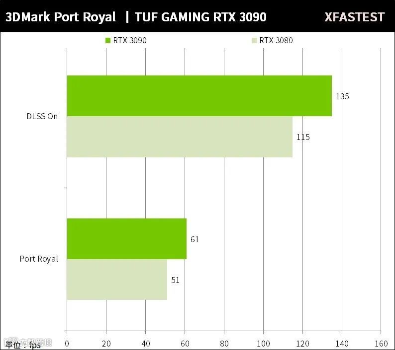 在Port Royal开启光追功能后,RTX 3090可达到61FPS的表现,再结合DLSS 2.0 Performance,更可加速到135FPS,对比RTX 3080 有着更强更出色的光线追踪与DLSS AI渲染性能。