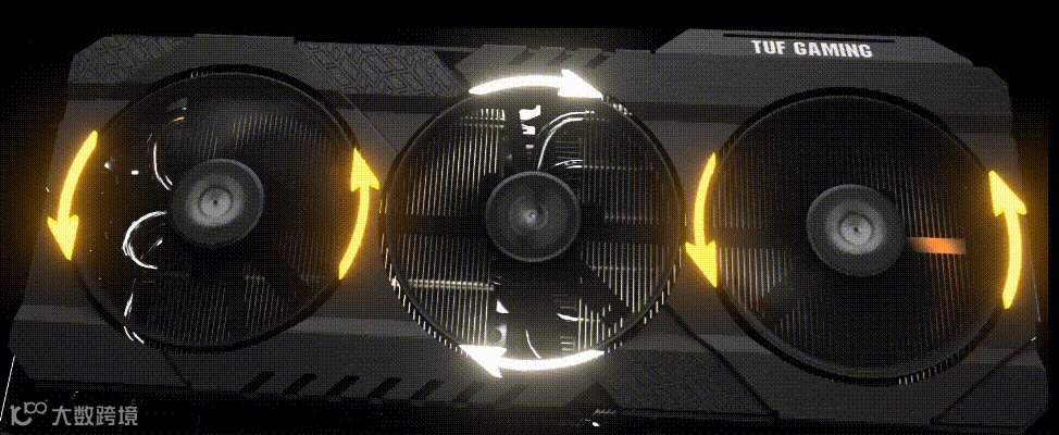 TUF RTX 3090 强悍散热一部分来自于轴流风扇设计,通过三风扇协同工作,两侧风扇的旋转方向与中央的风扇相反,以减少散热模组内部的空气乱流,同时保证散热稳定、高效。