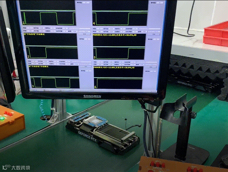 TUF RTX 3090 轴流风扇在制程中进行风扇全功能测试,包括对转速、电流、信号、电流波形、不同占空比下的转速电流测试等,保障风扇的散热量稳定,风扇噪音和风扇振动最小化。