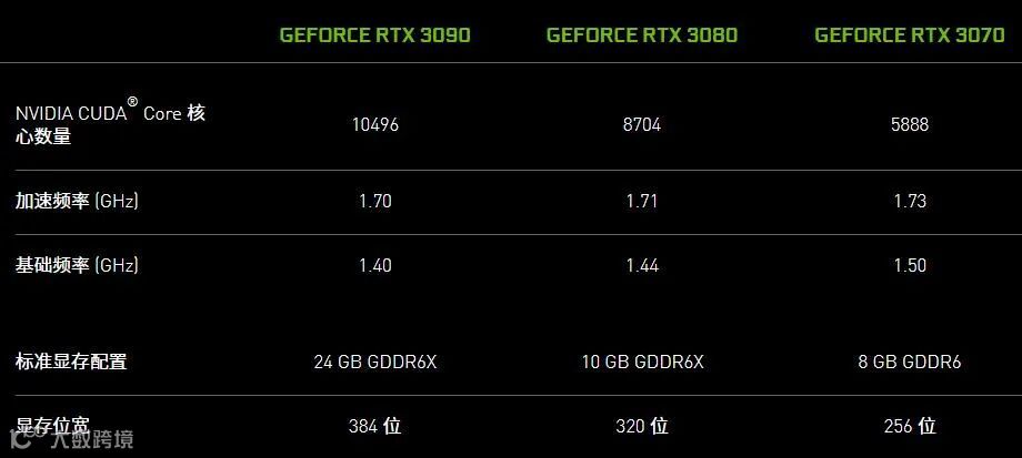 2020年9月,英伟达发布全新的GeForce RTX 30系列GPU(即RTX 3070、RTX 3080、RTX 3090),相比上一代(20系列)GPU性能提升100%,效率提升90%,英伟达称其为史上最大的芯片跨越,英伟达在芯片架构、定制流程设计、电路、逻辑、封装、series IO、显存、供电、散热、软件和算法等方面,将GPU的性能提升到极限,最终实现了“迈向未来的一大步”。