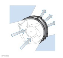 离心风扇工作时,叶片使空气沿着与轴垂直的方向流动,沿轴线进气,排气时则与轴线垂直。