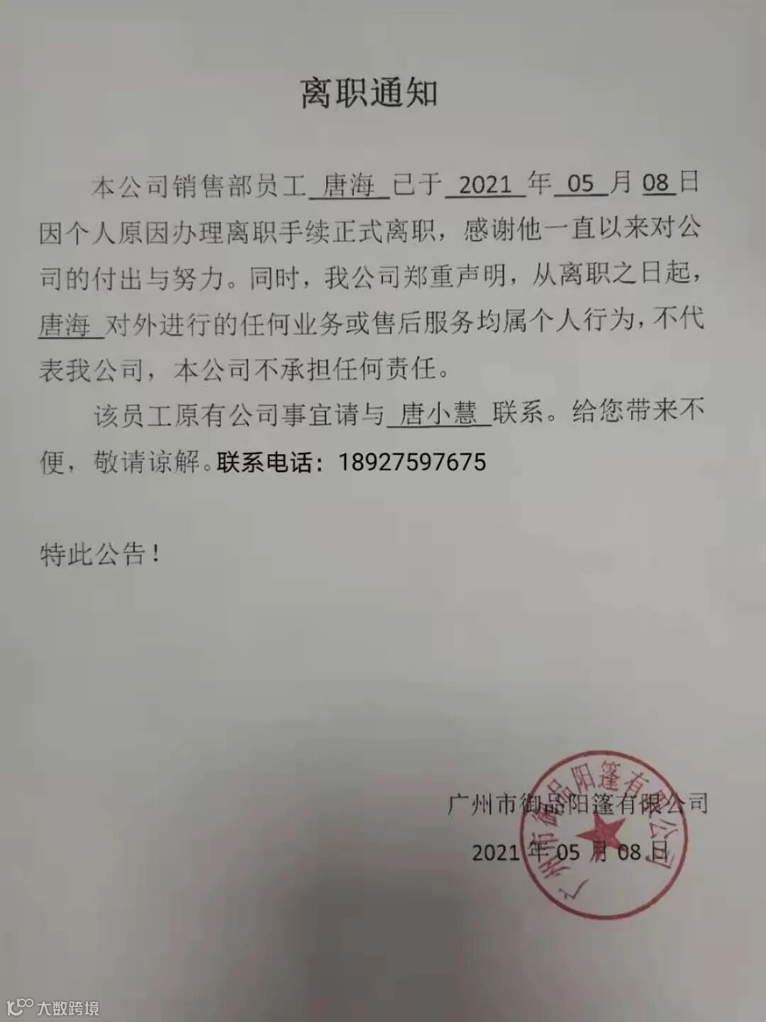 导读:本公司销售部员工:唐海 于2021年05月08日因个人原因正式离职。特此公告!