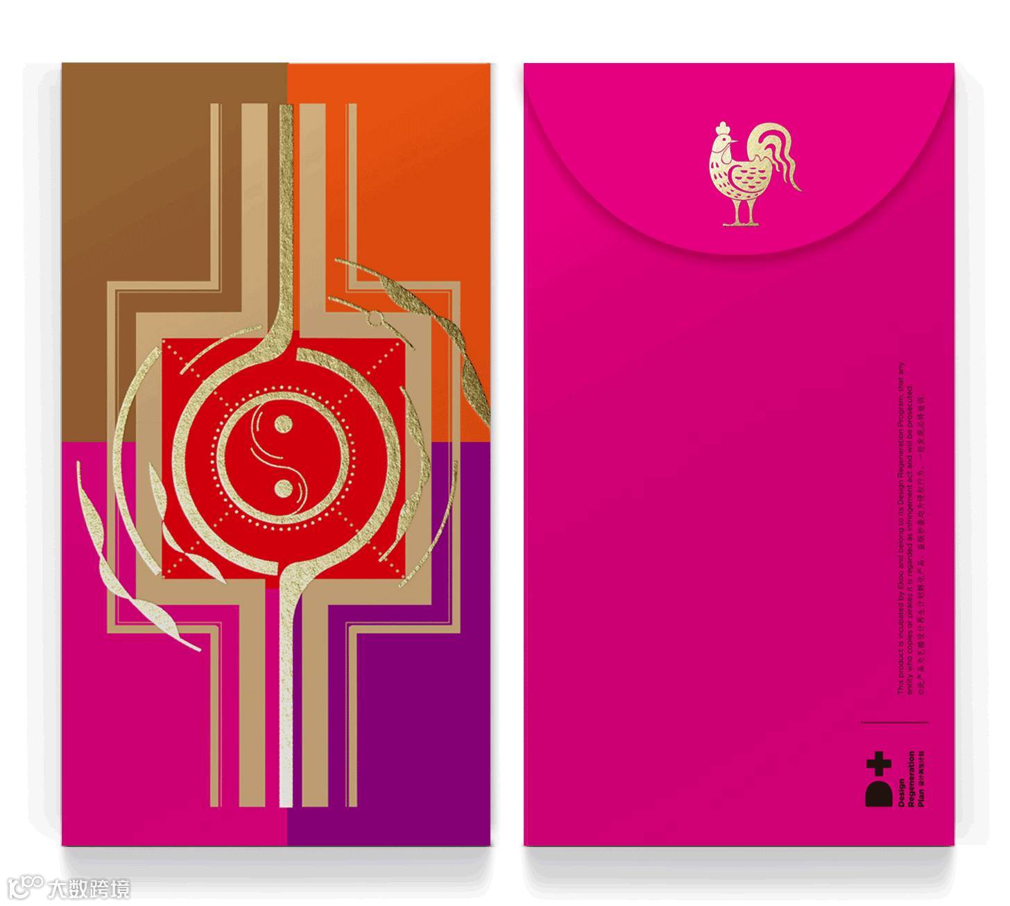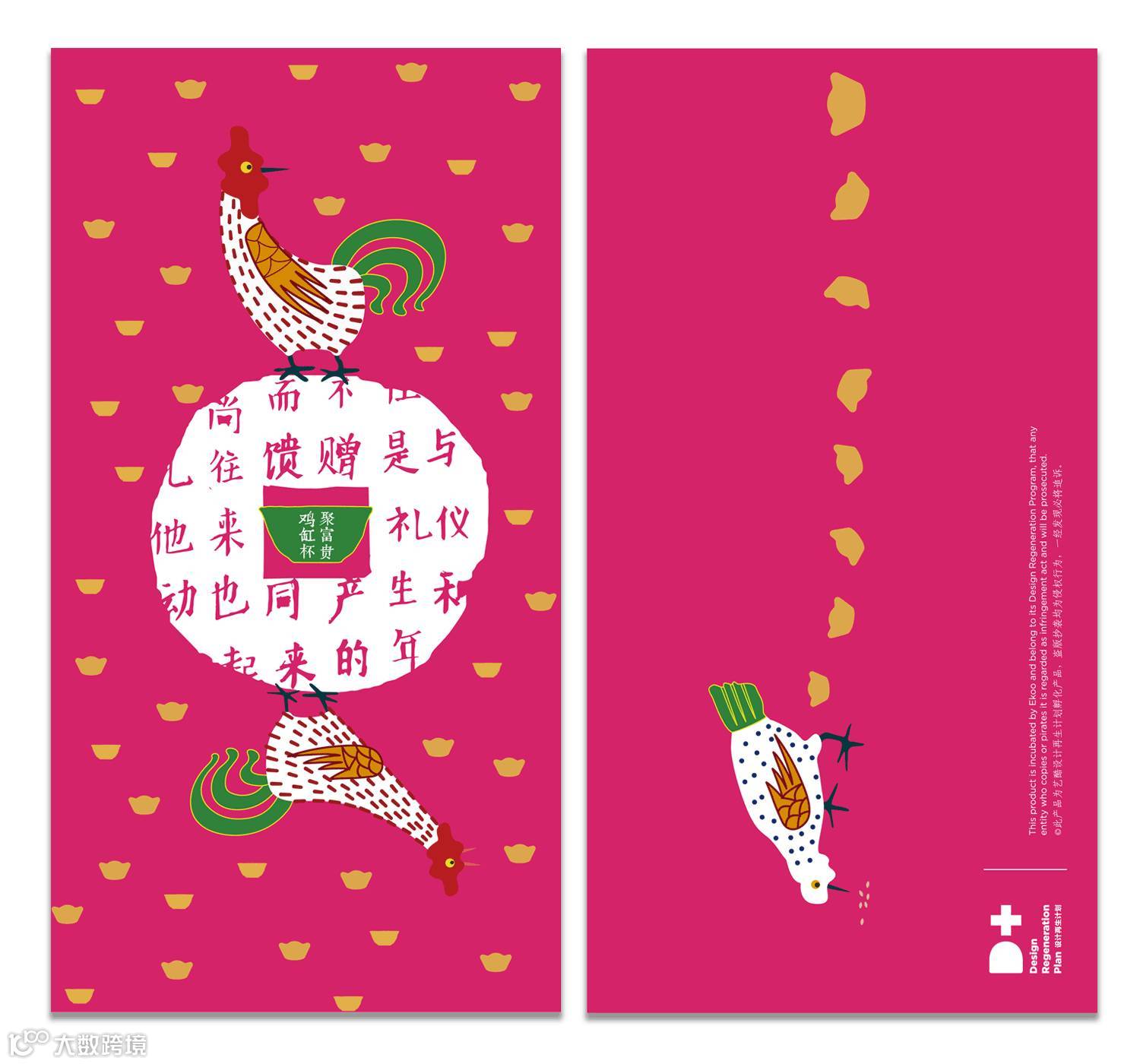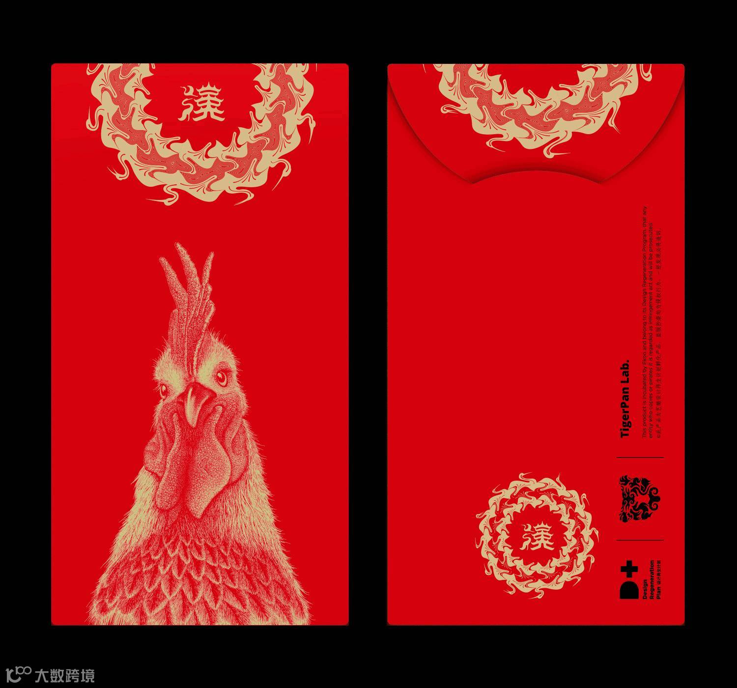 红包背面的折口在完全打开时,从正面可以得到一枚完整的红蛋,寓意新年吉瑞圆满。当半圆形折口折向背面时,在背面可以看到一只乖萌的小鸡,当折口完全插入弧形模切封口中,则呈现出头顶大红冠的公鸡形象。