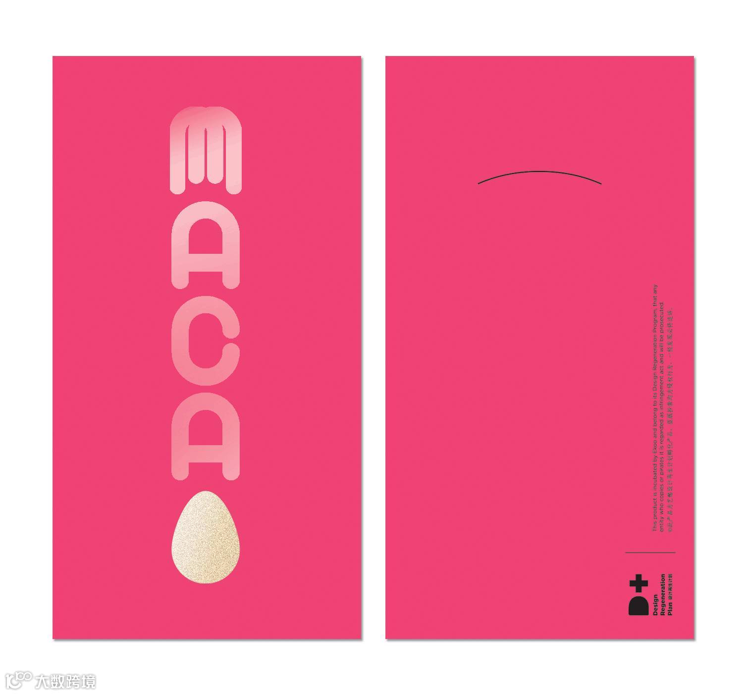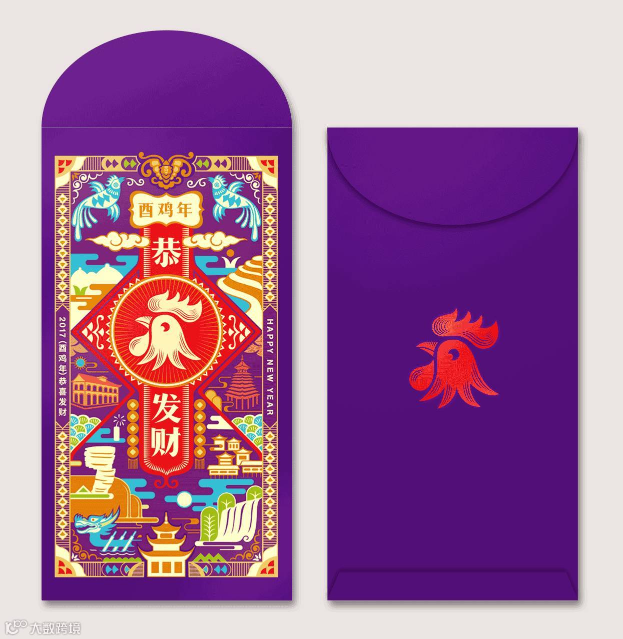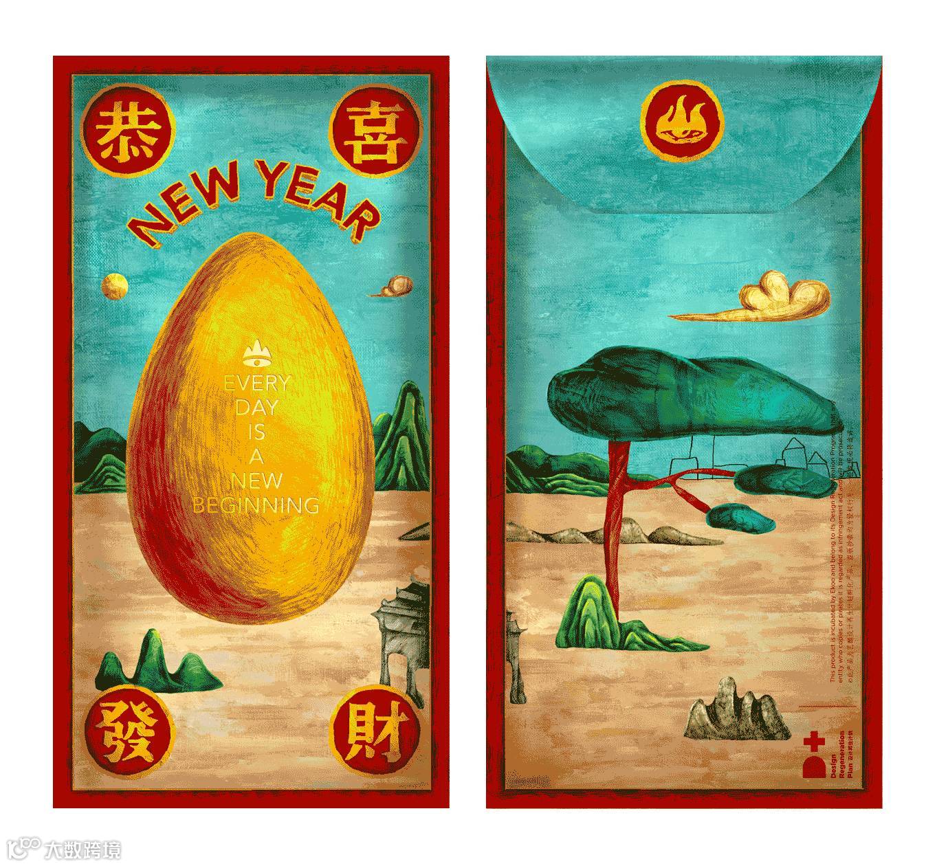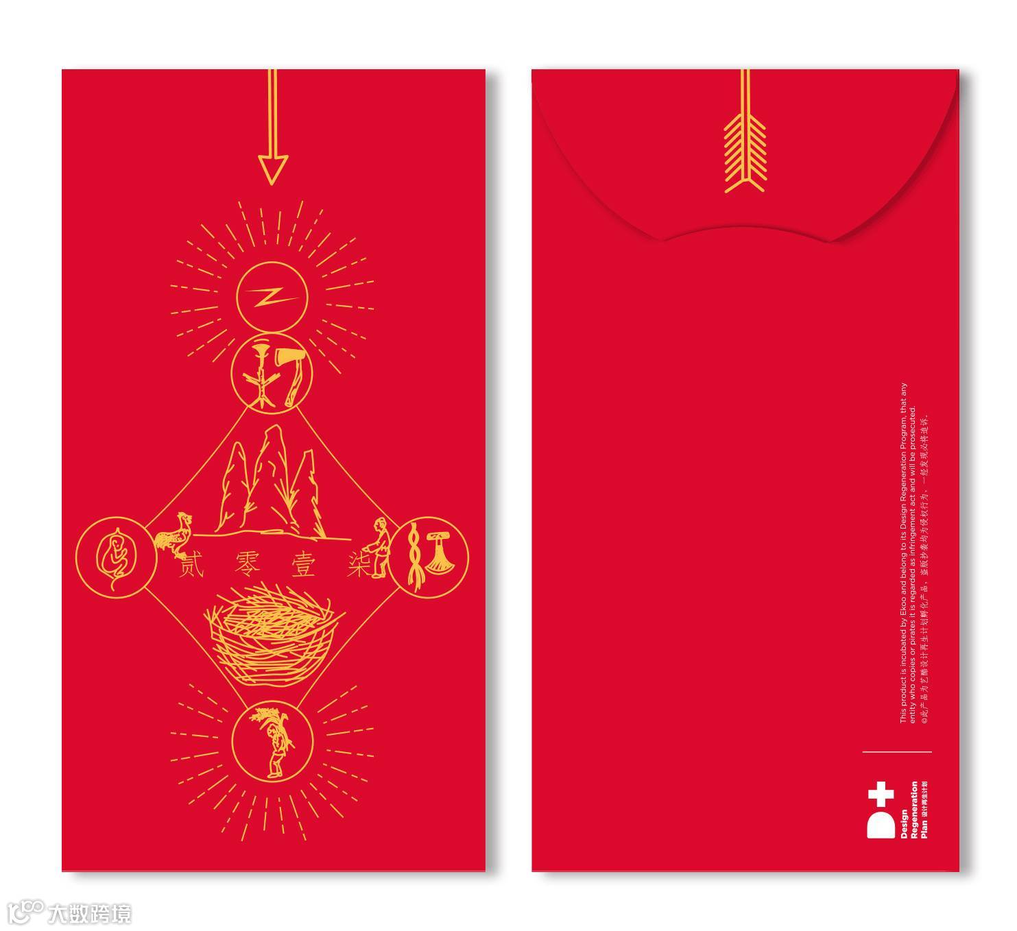 红包背面的折口在完全打开时,从正面可以得到一枚完整的红蛋,寓意新年吉瑞圆满。当半圆形折口折向背面时,在背面可以看到一只乖萌的小鸡,当折口完全插入弧形模切封口中,则呈现出头顶大红冠的公鸡形象。